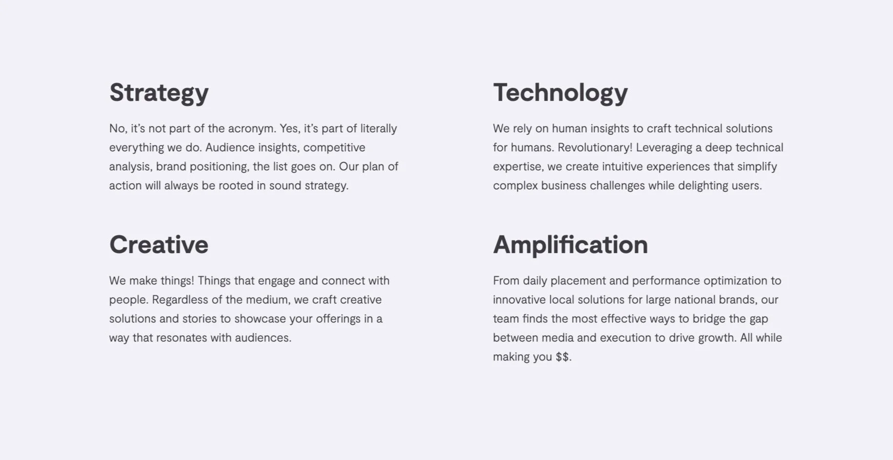 Brand Strategy: Ashley Heron, Sasha Agapov, Me // Design: Sasha Agapov, Luis Sepulveda, Kruise Sapstein, Yeojin Kwan // Copywriting: Me // UX: Alec Nickell, Lionel Durimel, Sasha Agapov // Motion Design: Grant Minear, Lionel Durimel // Dev: Owen Masback, Scott Wilson